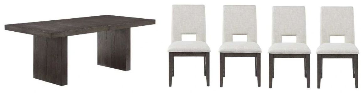 5 piece set includes the evan 78-96 inch dining table with 18-inch leaf and 4 evan linen-look side chairs. Each item also sold separately.