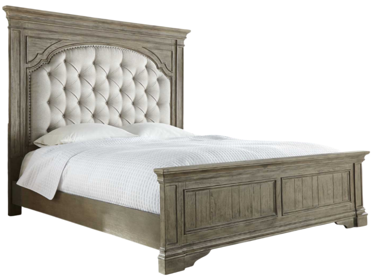Styling features include classic vintage styling with a tufted headboard, heavy molding, ship-lap footboard picture frame drawer fronts and pewter hardware