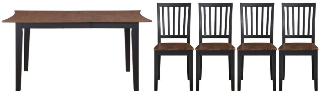 Paired with four schoolhouse-inspired side chairs, finished in coordinating walnut and ebony tones, each scooped seat offers comfort while solid wood construction ensures lasting durability. Perfect for dining rooms or cozy spaces, Joplin delivers warmth, strength, and classic appeal.