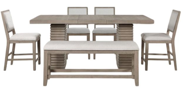 Experience modern elegance with the Lily 5-piece counter dining Set. Crafted from ash veneers acacia and mango solids, its greige finish complements contemporary interiors. Clean lines and a minimalist aesthetic exude refinement, while the reeded design adds depth. Expand the table from 60 to 78 inches with the included leaf, accommodating up to eight guests.Read More