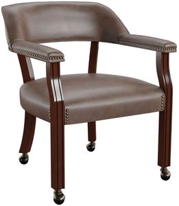 Enjoy both game night and dining night with this versatile dining and game chair. The upholstered captain’s chair, featuring casters for easy mobility, is shown in brown but available in other colors. With nailhead trim and a rich cherry finish, it suits both gaming and dining occasions.Read More