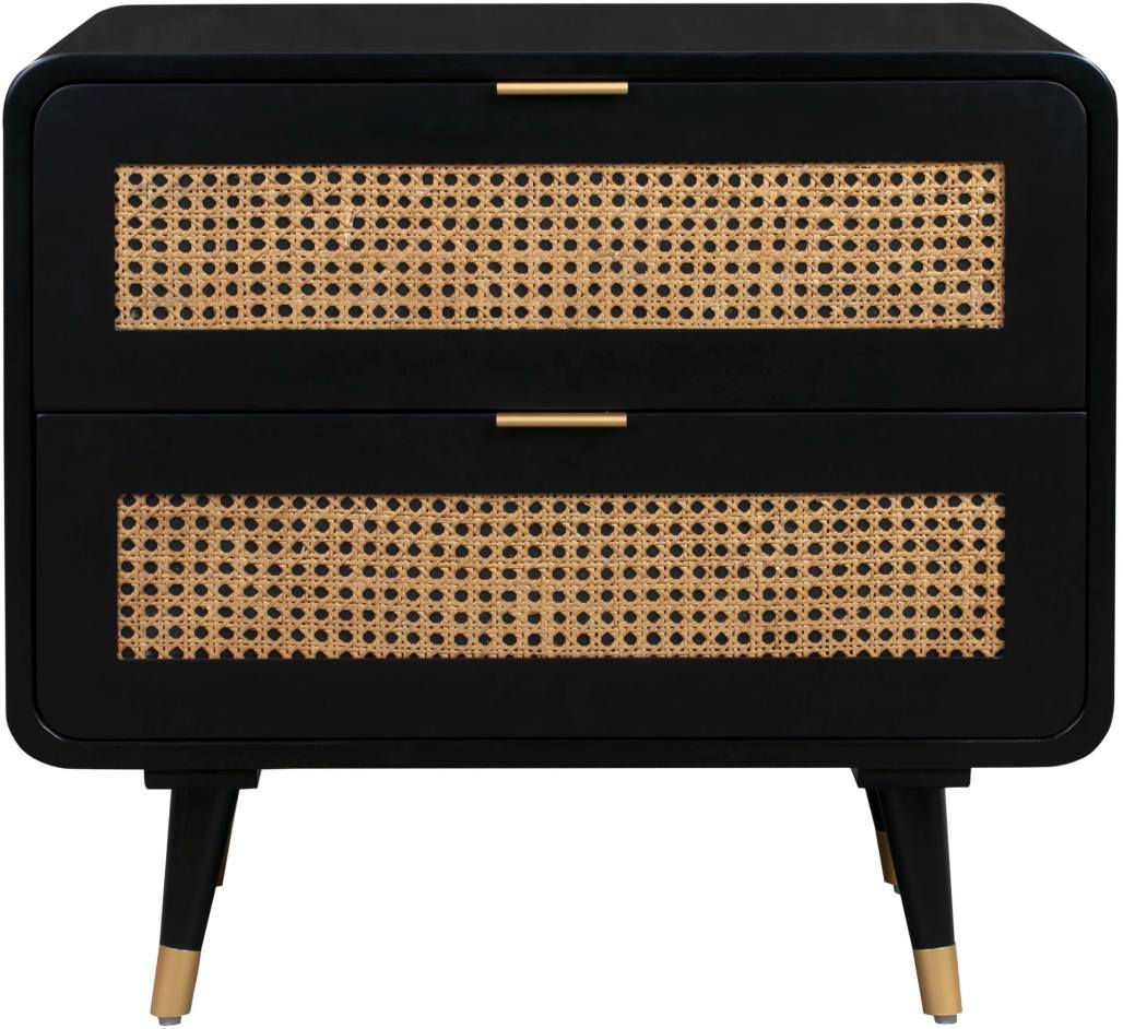 Drawing inspiration from the ever classic mid-century style, the Christine nightstand adds a retro look to any space its placed. This nightstand features spacious drawers, a black Acacia finish embellished with cane webbing and conical legs to complete the look.