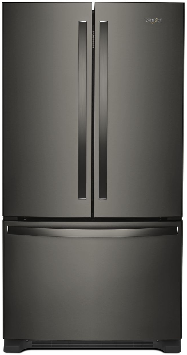 Whirlpool® 20 Cu. Ft. Wide Counter Depth French Door Refrigerator-Fingerprint Resistant Black Stainless Steel with humidity-controlled crispers and frameless glass shelvesRead More