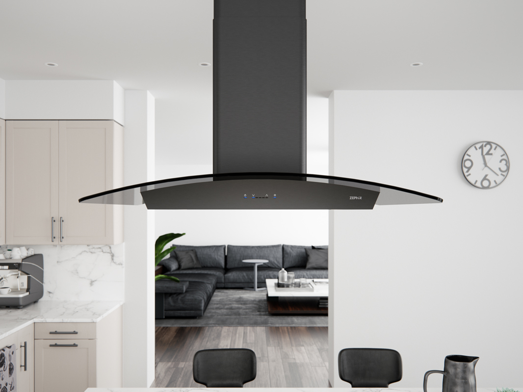 The delicate curve of a smoke-gray glass canopy arching over your island cooktop will add an elegance to your everyday cooking experience. The Ravenna features our sleek black stainless steel finish with an anti-smudge Titanium coating for extra durability and easy cleaning. Complete with our exclusive Airflow Control Technology™ (ACT™), ICON Touch® Controls, BriteStrip™ LED lighting and a powerful, yet quiet, 600-CFM blower.Read More