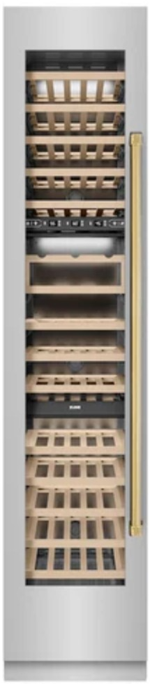 Luxury isn’t meant to be left desired—it’s meant to be attainable. The ZLINE Autograph Edition 18 in. 9.0 cu. ft. Triple Zone 68 Bottle LEft Hinge Column Wine Cooler in Stainless Steel with Polished Gold Accents (RCWVLZ-30418-G) combines the convenience of a sleek integrated tall column built-in design with triple zone temperature control and spacious storage capacity for up to 68 wine bottles. Achieve ZLINE Attainable Luxury® excellence with innovative features that showcase your collection in unparalleled style and ensure that every pour is perfection.Read More