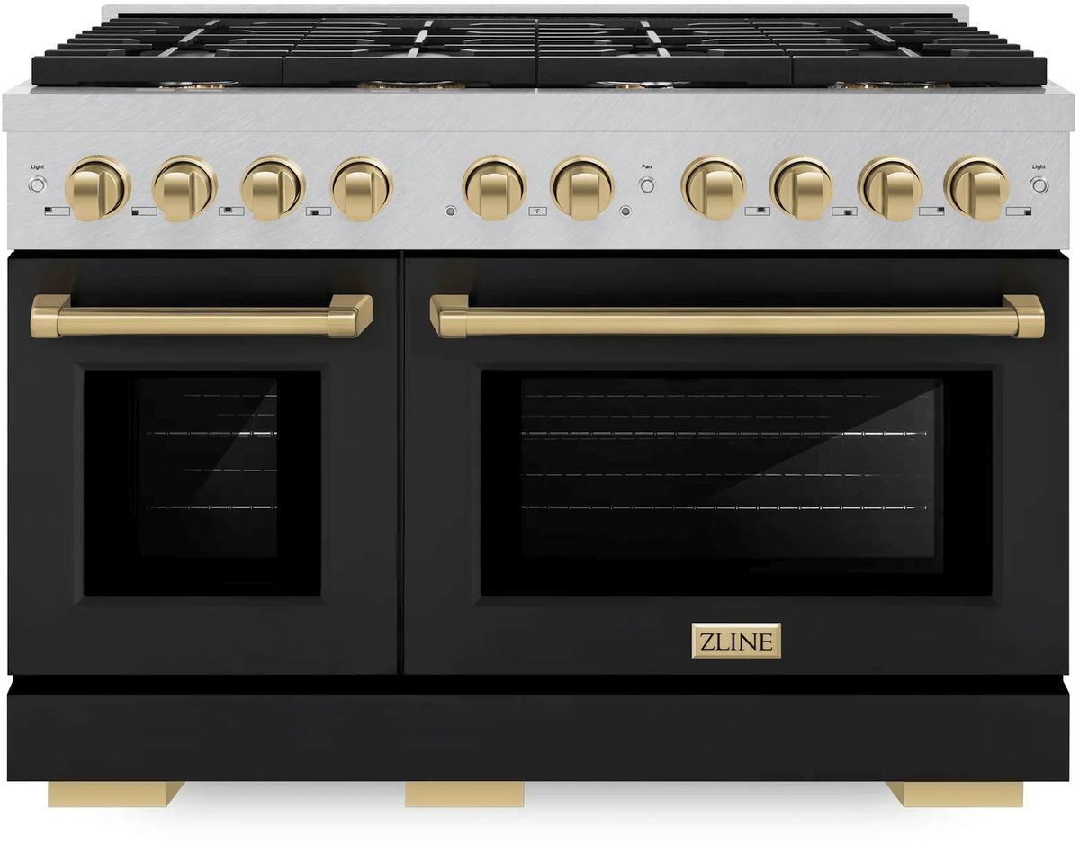 The ZLINE Autograph Edition 48 in. 6.7 cu. ft. Paramount Double Oven Dual Fuel Range with 8 Burner Gas Cooktop in Satin Stainless Steel with Black Matte Doors and Champagne Bronze Accents (SDRSZ-BLM-48-CB) combines the versatility of a gas cooktop with 8 Italian-made auto-reignition burners, a large high-performing electric convection oven and a small bake-and-broil oven with digital thermostat technology, enhanced cast iron grates, beautiful black matte doors with Horizon window designs, and elegant champagne bronze knobs and handles allowing you to master every meal.